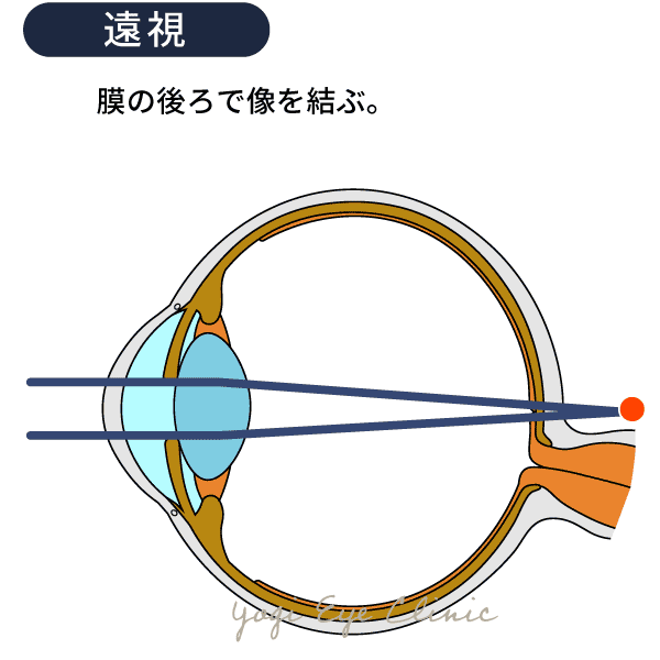 目に入った光が網膜の後ろで像を結ぶ状態です。角膜や水晶体の屈折力が弱いか、眼球が短いために起こります。